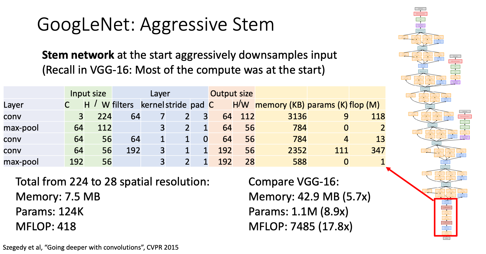 Recall in VGG-16, most of the compute was at the start (the Conv layer). GoogLeNet introduces the concept of “stem network” to deal with this problem