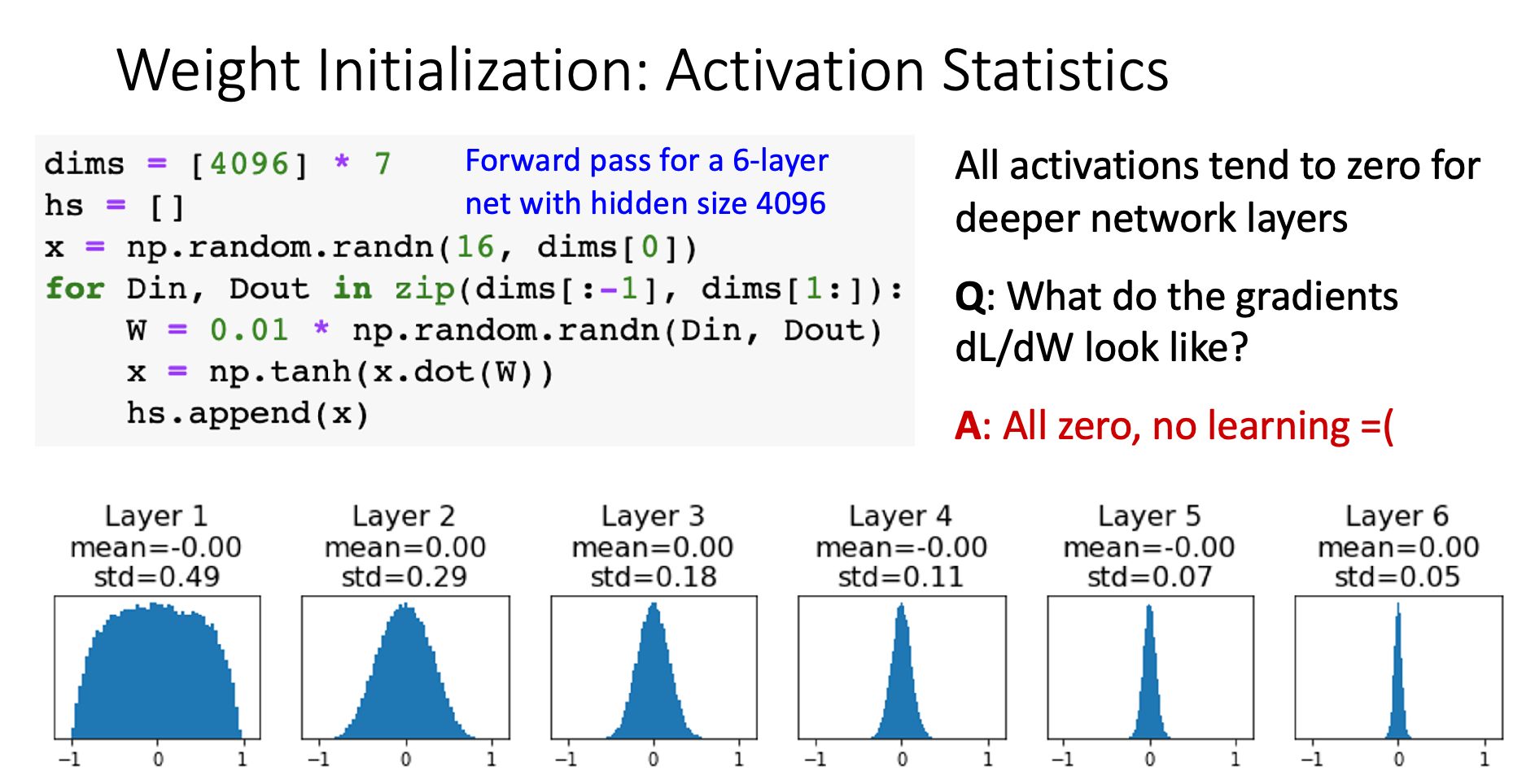 Problem chain: Weight small → Layer output small → Activations cluster near 0 → Next layer input small → Repeat…