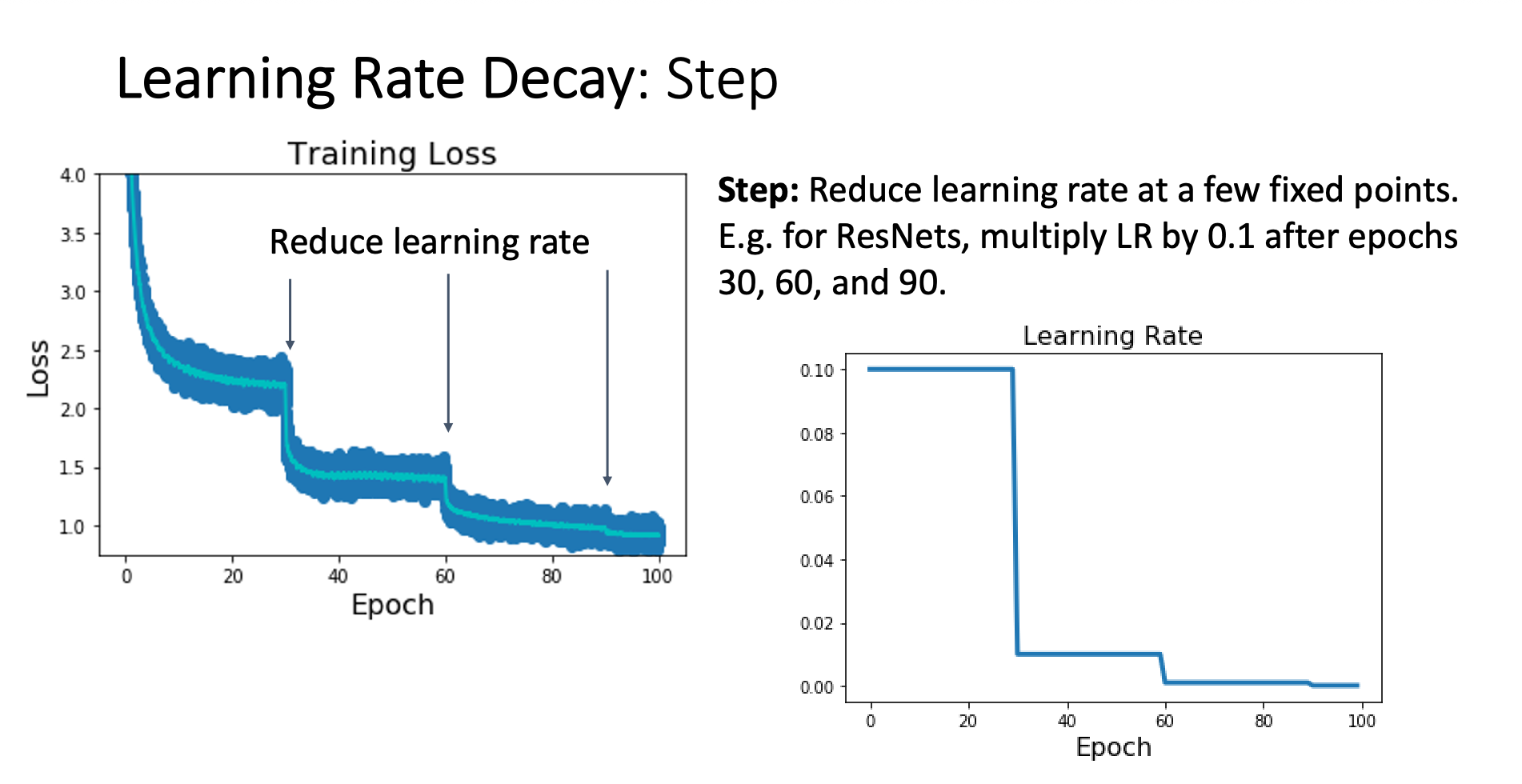 - Decreasing LR → Loss curves become progressively smoother