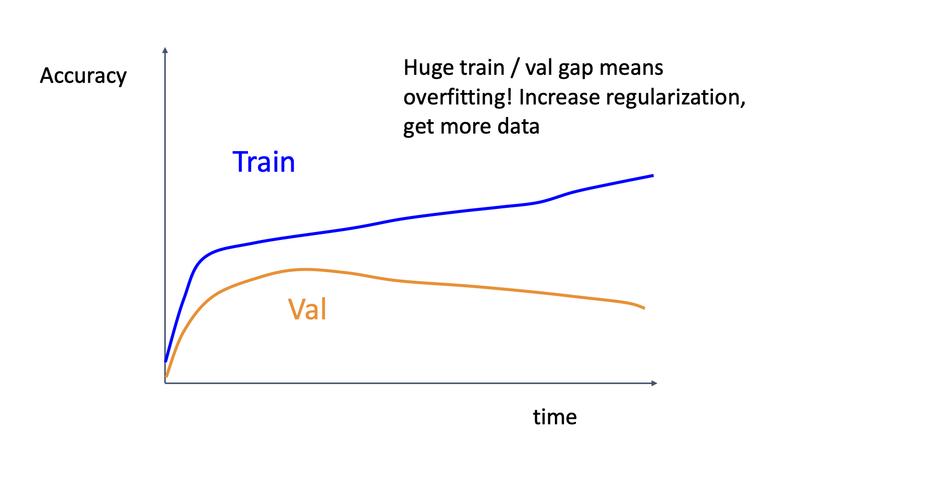 We’ll try to train 100% training accuracy on a small sample of training data (~5-10 minibatches); experiment with architecture, LR, weight initialization till things works
