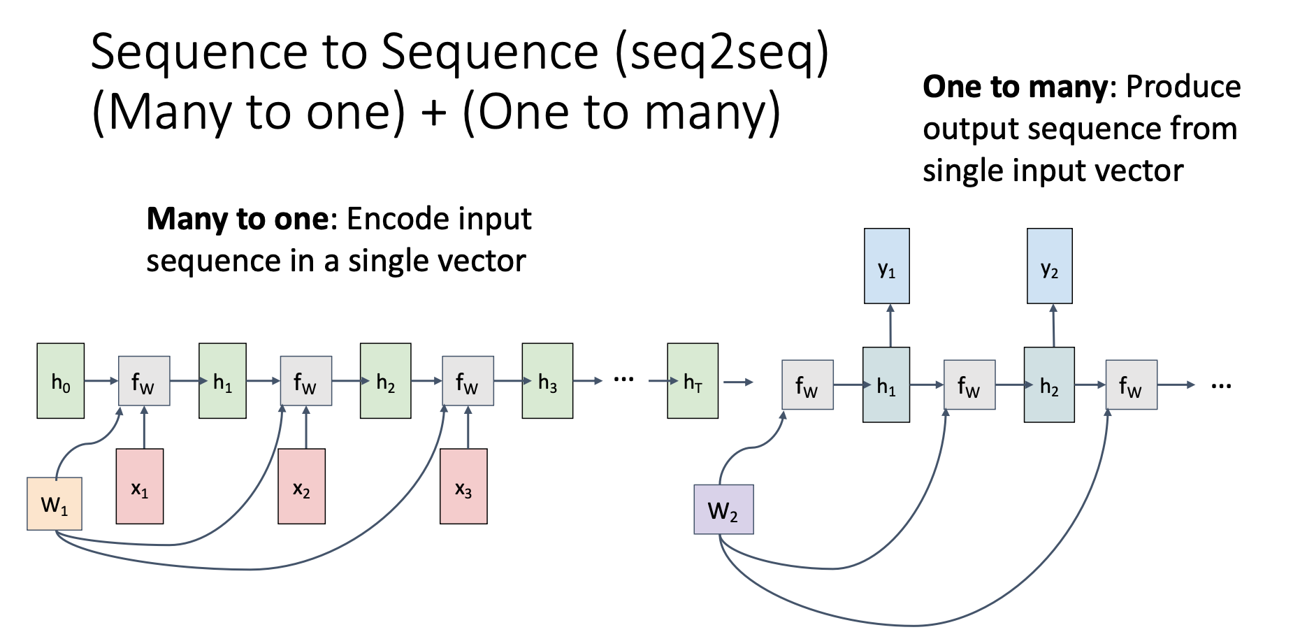 In sequence to sequence, we concatenate a “many to one” RNN and a “one to many” RNN together, using the final hidden state produced by the first RNN as the initial hidden state of second RNN