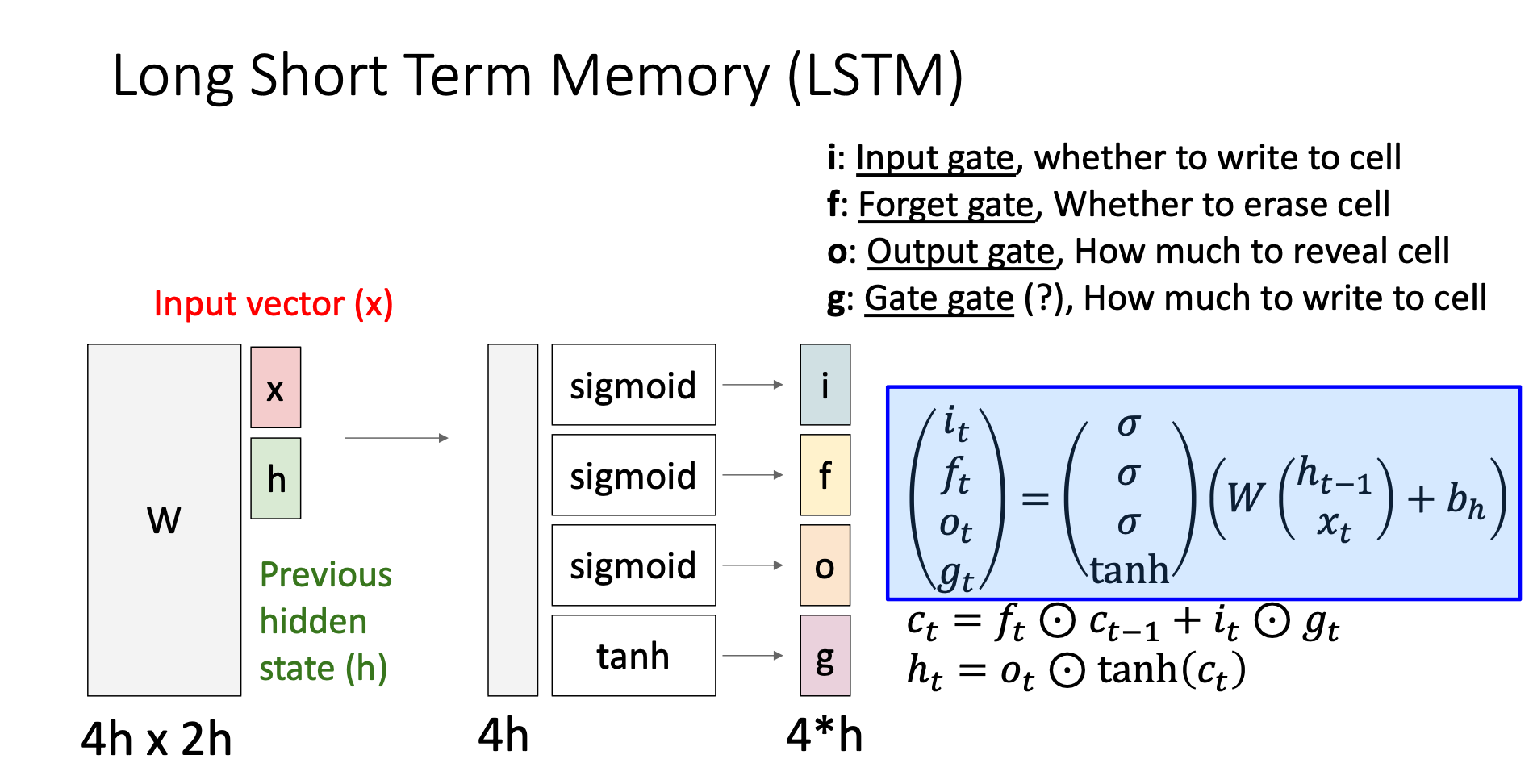 In vanilla RNNs, the weight matrix multiplication directly gives us the hidden state. However, in LSTM, we cut the matrix into 4 parts then let them through different activation functions. These give us four output gates