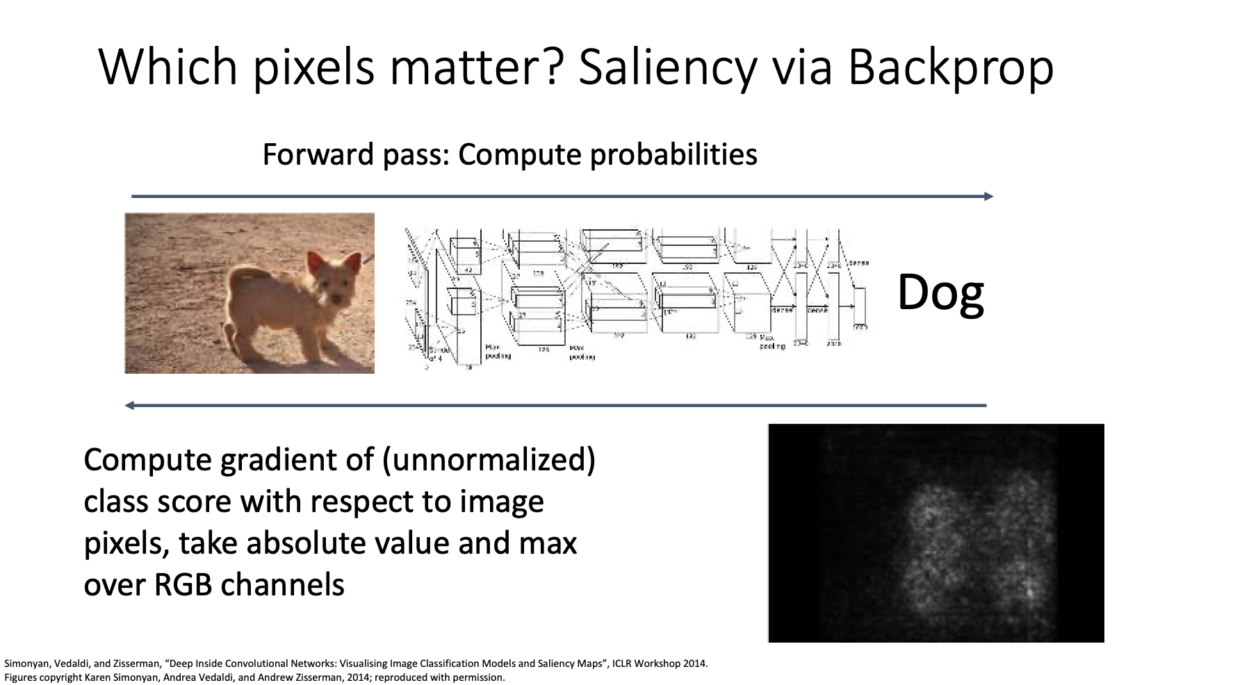 Compute gradient of class scores with respect to actual image pixels, then we can know how strong will each pixel in the image affect the class score